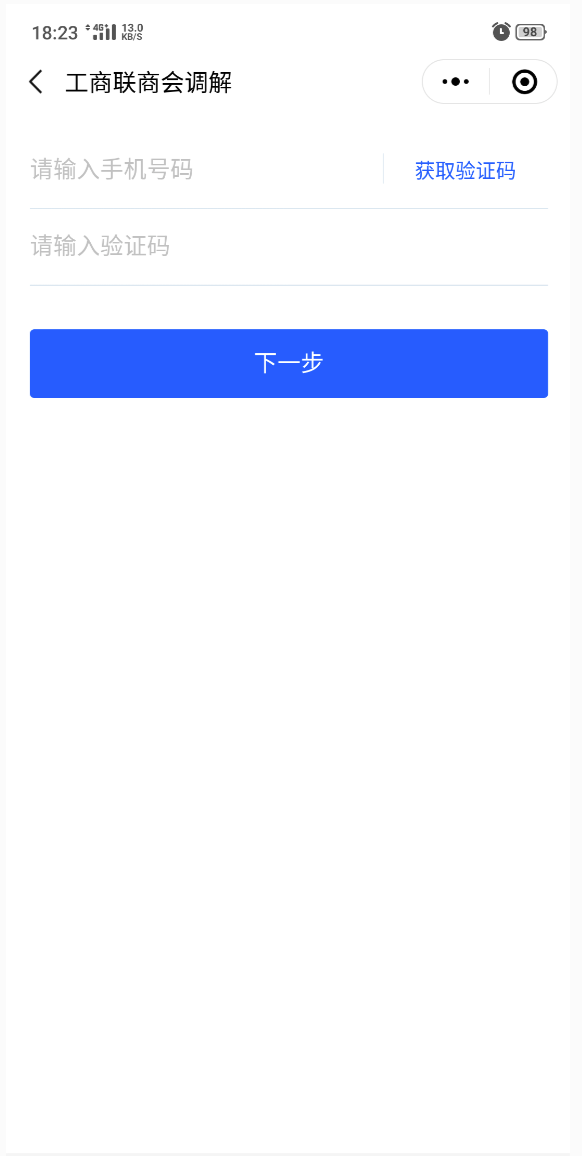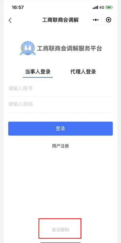 第一步:打开【工商联商会调解】小程序,点击忘记密码。